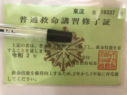 この受講を受けると大阪市消防局から「普通救命講習終了証」が授与されます。