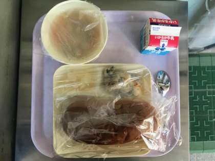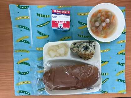 今日のメニューは「帆立(ほたて)貝のグラタン・スープ・和梨・黒糖パン・牛乳」の5品です。