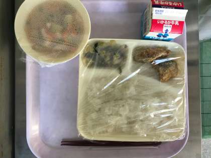 今日のメニューは「鯖(さば)のカレー竜田揚げ・さつまいもと薄揚げの味噌汁・白菜とほうれん草の煮びたし・ご飯・牛乳」の5品です。