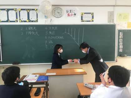 朝の全校集会で伝達した「普通救命講習修了証」を2年2組の衛生委員にお渡ししました。