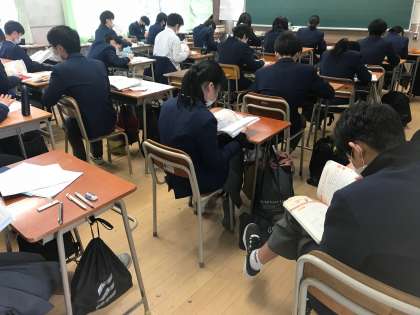 休み時間と問題配布前の最後の勉強時間の風景です。