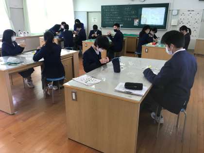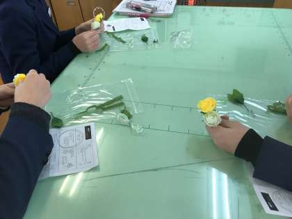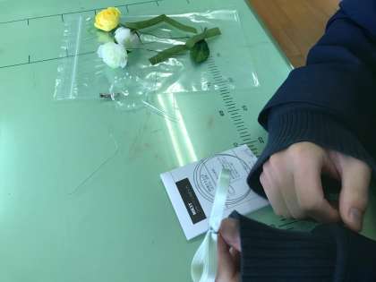リボンを結んで、お花をつけて、……コサージュを作っています。