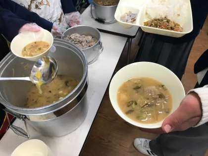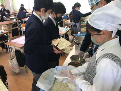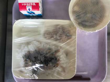 今日のメニューは「鶏牛蒡(ごぼう)ご飯(刻み海苔を添えて)・焼き蓮根(れんこん)・味噌汁・牛乳」の4品です。