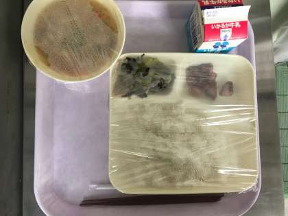 今日のメニューは「泉だこの柔らか煮・味噌汁・小松菜の煮浸し・ごはん・牛乳」の5品です。