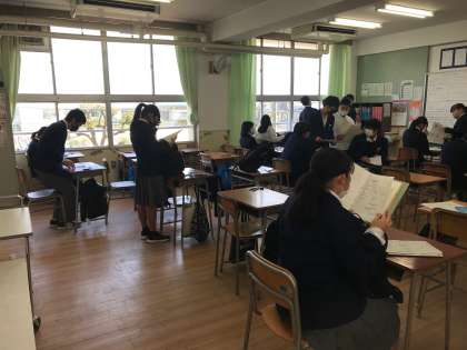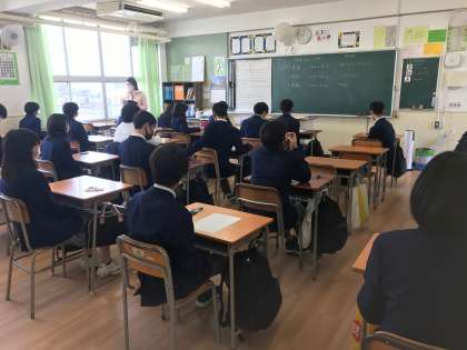 写真中)テスト用紙が配布されて、緊張感高まる2年2組さん