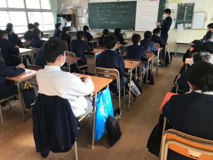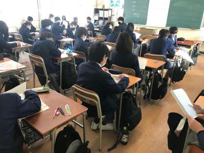 写真上)テスト用紙配布前、最後の追い込みに余念のない1年1組さん