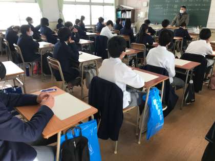 写真下)テスト用紙配布終了、無言で緊張感を高める1年3組さん