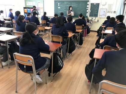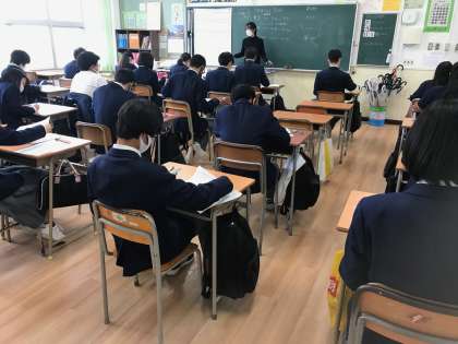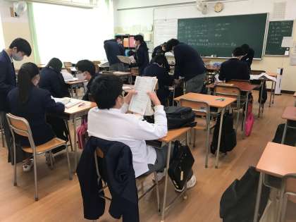 写真中)チャイムと同時にテストに取り組む2年3組さん
