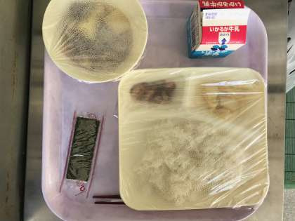 今日のメニューは「肉じゃが・白菜のゆず風味・とら豆の煮物・焼き海苔・ごはん・牛乳」の6品です。