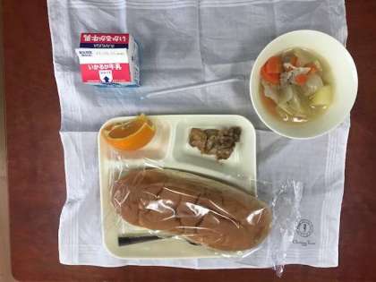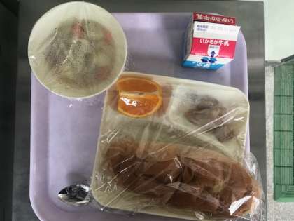 今日のメニューは「鶏肉の味噌バターソース・スープ煮・デコポン・おさつパン・牛乳」の5品です。