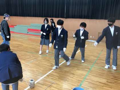 離れた場所から長い紙をクルクル巻いた棒を壺に投げ入れて点数を競う遊びです。