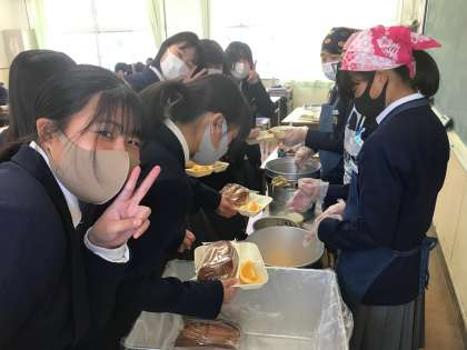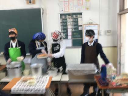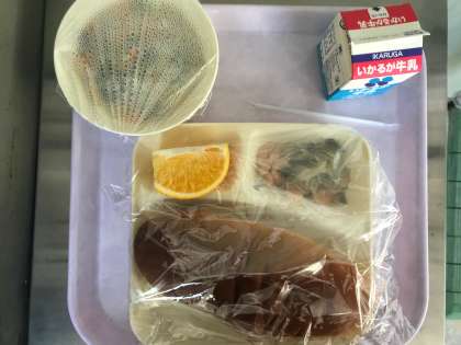 今日のメニューは「海老と野菜の炒め物・中華がゆ・はっさく・黒糖パン・牛乳」の5品です。