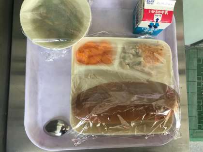 今日のメニューは「マカロニグラタン・レタスのスープ・缶みかん・黒糖パン・牛乳」の5品です。
