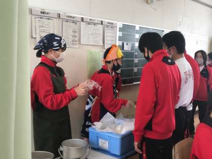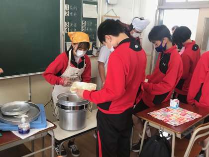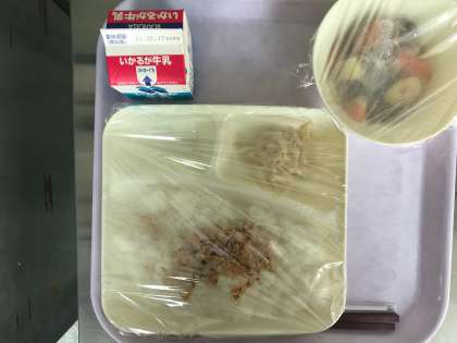 今日のメニューは「肉じゃが・ごまかか炒め(ご飯)・もやしのゆずの香和え・牛乳」の4品です。