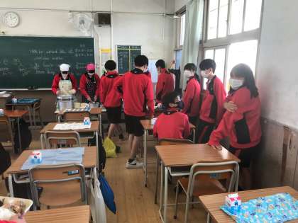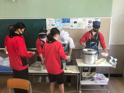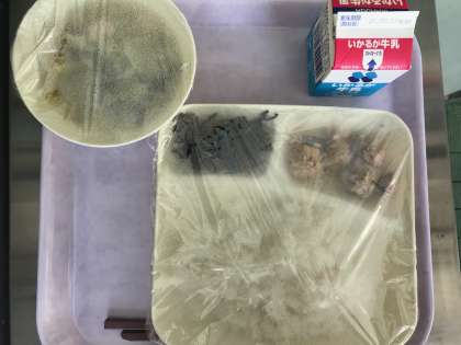 今日のメニューは「鮭(さけ)の胡麻(ごま)みそ焼き・ひじきの炒め煮・五目汁・ごはん・牛乳」の5品です。