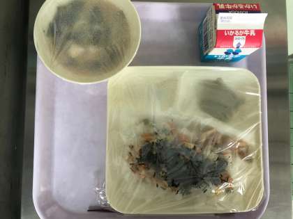 今日のメニューは「かやくご飯(ご飯・刻み海苔を添えて)・味噌汁・抹茶外郎(ういろう)・牛乳」の4品です。