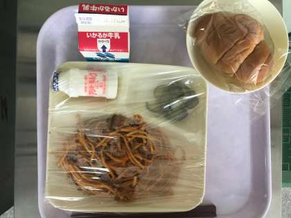 今日のメニューは「スパゲッティミートソース・きゅうりのピクルス・黒糖パン・発酵乳・牛乳」の5品です。