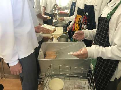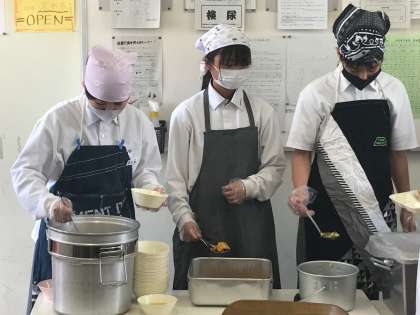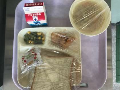 今日のメニューは「鶏肉のカレーマヨネーズ焼き・三度豆のコーンサラダ・てぼ豆のスープ・食パン(リンゴジャムを添えて)・牛乳」の5品です。