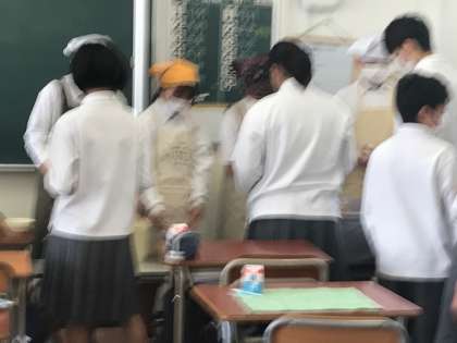 今日のメニューは「海老(えび)のチリソース・中華スープ・和梨(カット缶)・黒糖パン・牛乳」の5品です。