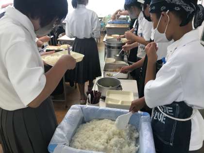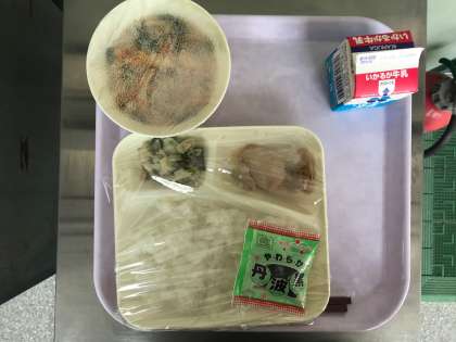 今日のメニューは「鶏肉のおろし醤油かけ・野菜炒め・味噌汁・ソフト黒豆・ご飯・牛乳」の6品です。