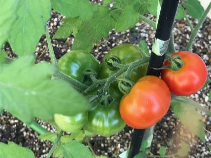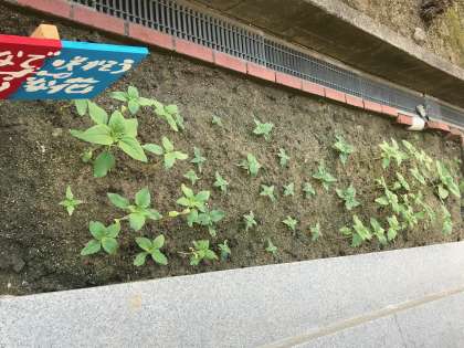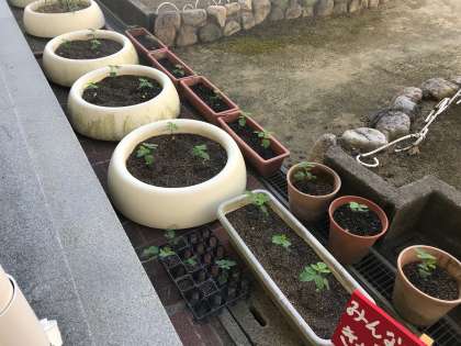 写真中)ここは花壇(かだん)です。ひまわりが大きくなっています。