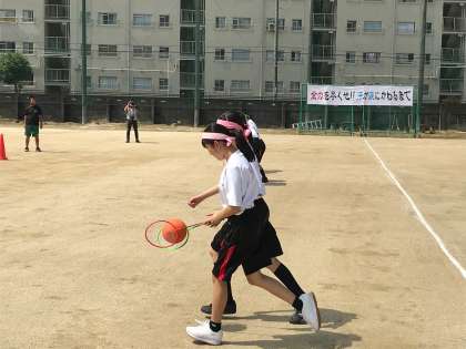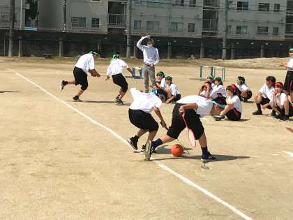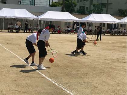2人がラケットを1本ずつ持ち、それでボールを挟んで運び、その速さを競うレースです。