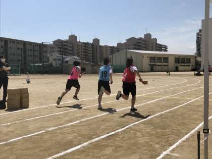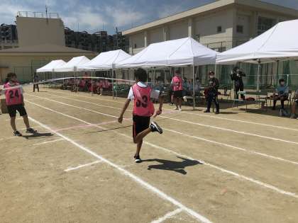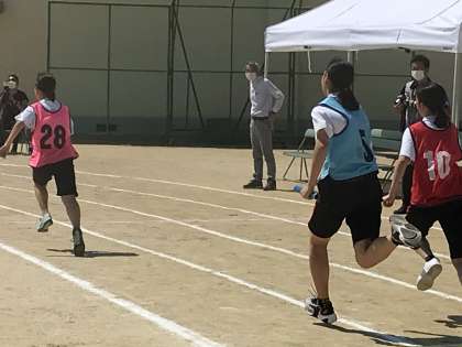 50m走、50mハードル走、投てき競技、100m走、バラエティー走、スプーン競走、ラケット挟み競走、宅配便競走と進んでいきました。