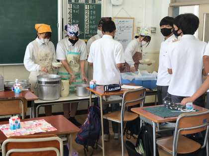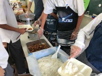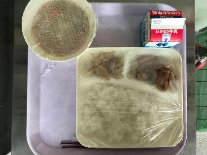 今日のメニューは「豚肉の香味あげ・もやしのお浸し・味噌汁・ご飯・牛乳」の5品です。