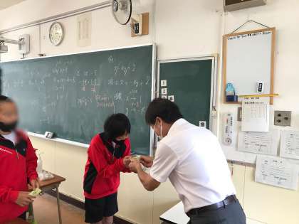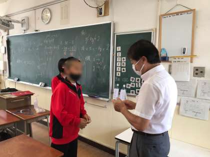 今日は1年1組の教室にお邪魔して、衛生委員のお二人に救急救命講習の修了証をお渡ししました。