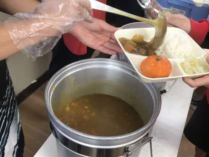 今日のメニューは「チキンカレーライス(ご飯)・キャベツとコーンのサラダ(ノンエッグハーフドレッシング付き)・冷凍みかん・牛乳」の4品です。