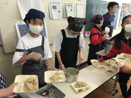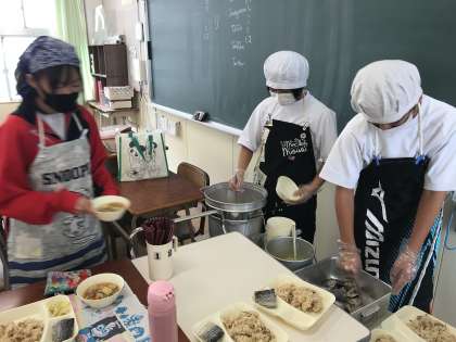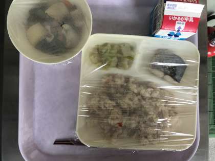 今日のメニューは「かやくごはん・さごしの塩焼き・キャベツの梅風味・豚肉とじゃがいもの煮物・牛乳」の5品です。