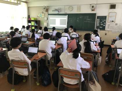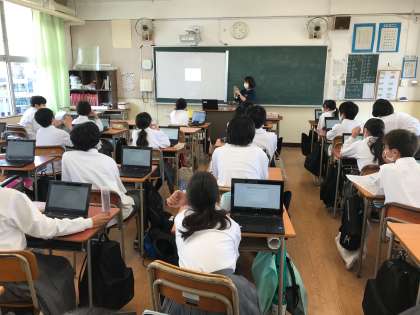 上手く操作できず困っている先生に生徒席からああしたら・こうしたら、のアドバイスがあります。
