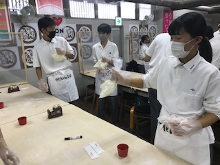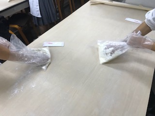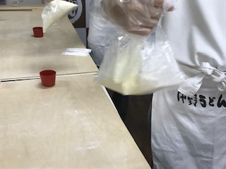 今度は小麦粉に食塩水を加えて生地作り体験。