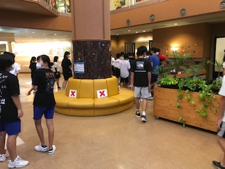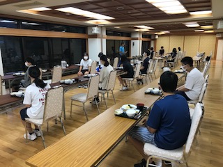 例年なら3クラス一カ所・丸テーブル向かい合いで食事をするのですが、三密回避のため2会場・向きは同じで黙食にしています。