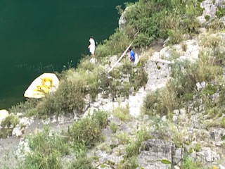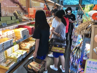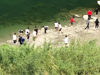 チームビルディングとツリートレッキングとお土産購入の3メニューをクラスごとにローテーションしています。お土産購入が終われば川原で遊びます。