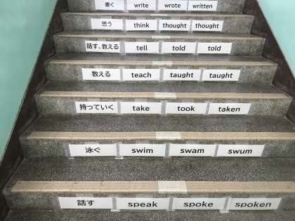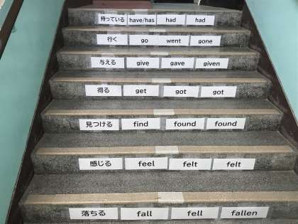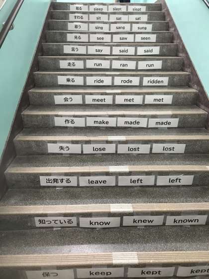 先週、学びサポーターさんが英語の不規則動詞のカードを西階段に掲示してくださいました、とお知らせしました。