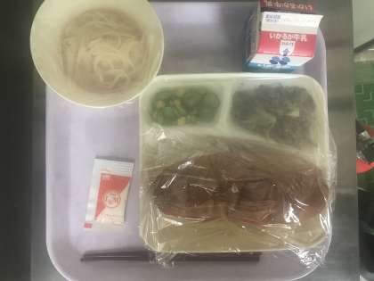 今日のメニューは「牛肉のカレー風味焼き・きゅうりとコーンのサラダ(ノンエッグドレッシング添え)・ほたて貝とトマトのスープスパゲッティ・黒糖パン・牛乳」の5品です。