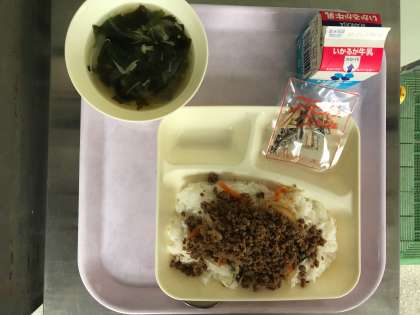 今日のメニューは「ビビンバ(肉y・野菜・ご飯)・わかめスープ・アーモンドフィッシュ・牛乳」の4品です。