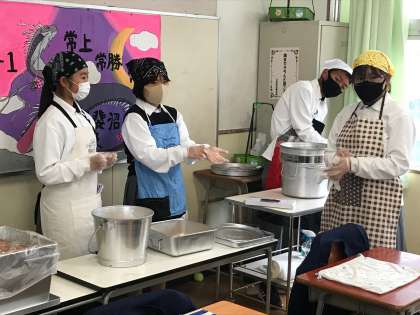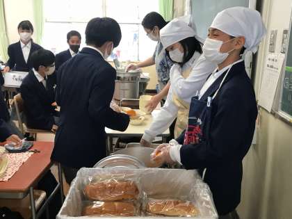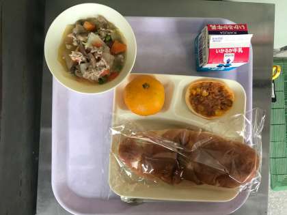 今日のメニューは「変わりピザ・豚肉と野菜のスープ煮・おさつパン・みかん・牛乳」の5品です。