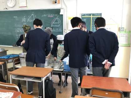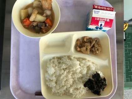 今日のメニューは「関東滝(かんとだき)・蓮根(れんこん)の梅風味焼き・海苔(のり)の佃煮(つくだに)・ご飯・牛乳」の5品です。