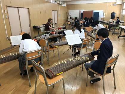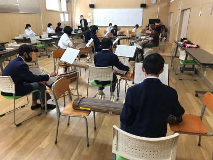 写真中下)1年の音楽、ゲストの先生による筝の授業です。