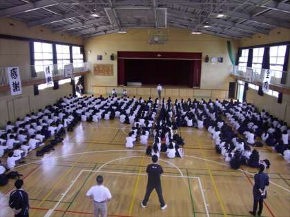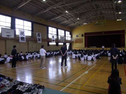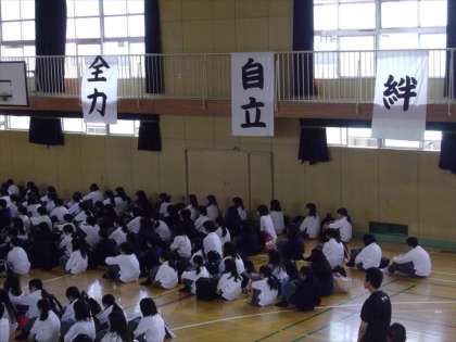 5月15日(金)中間テスト終了後、今年度3学年全員が揃っての第1回目の部活動集会を行いました。初めに、井高野中学校の部活動スローガンである「絆」「自立」「挑戦」「全力」「感謝」「情熱」の確認を行いました。続いて、部活動の決まりの確認。あいさつ日本一を掲げて、ソーシャルトレーニングの一環としてでもある、あいさつ練習、返事練習、笑顔練習を行いました。最後に、部長団の団長から「先輩から受け継いだものを大事にして、自分たちは後輩たちにこれは伝えたい、残したいというものを残して3年はやっていきたい」と副団長からは「全部の部活動がともにがんばろう」という話がありました。今年度も応援される活動を決意し、部活動をしっかりと盛り上げていく話し合いとなりました。