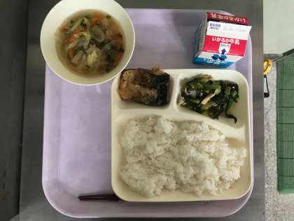 今日のメニューは「さばの霙(みぞれ)かけ・小松菜の煮浸し・すまし汁・ご飯・牛乳」の5品です。