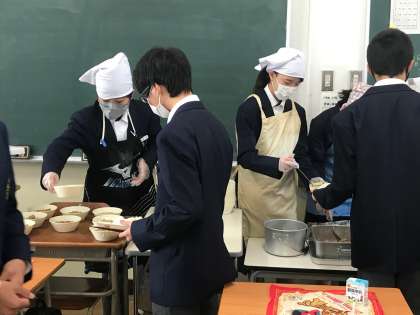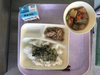 今日のメニューは「豚肉のスタミナ焼き・厚揚げと冬野菜のあったか煮・じゃこ菜っ葉・ご飯・牛乳」の5品です。