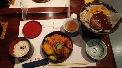 お昼ご飯は「陶板ハンバーグ膳」、かなりのボリュームです。