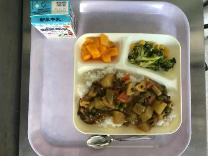 今日のメニューは「冬野菜のカレーライス(ご飯)・ブロッコリーとコーンのサラダ・黄桃(缶)・牛乳」の4品です。