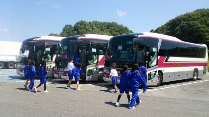 赤松パーキングエリアでトイレ休憩を取りました。バスの中ではしゃぎ過ぎて注意された生徒がいました。バスに酔って気分が悪い人が少しいますがみんな元気です。