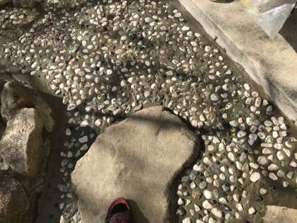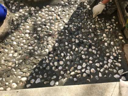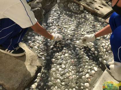 ひまわり学級の先生と生徒で玉砂利(じゃり)を敷き詰め、アクセントに色とりどりのビー玉を埋め込みました。