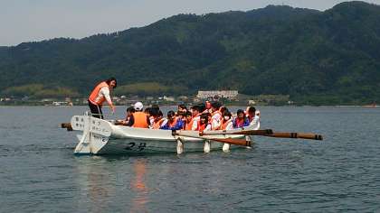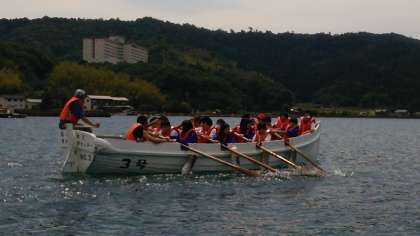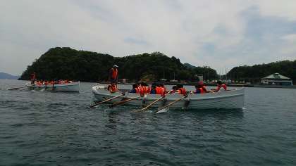 カッター訓練です。1、2と声をかけながら息を合わせて櫂を漕ぎます。