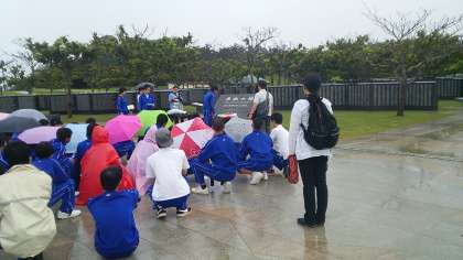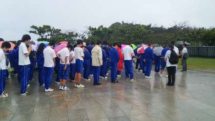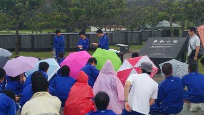 雨は少し小降りになりました。平和祈念公園でクラスごとに写真撮影してから、平和セレモニーを行いました。代表生徒がメッセージを読み上げ、作ってきた折鶴を供え、全員で黙祷しました。今からバスでホテルに向かいます。